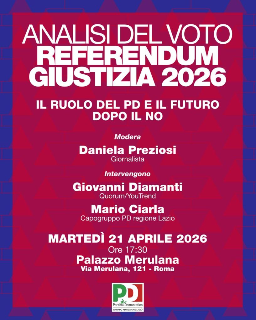 Il Gruppo PD Regione Lazio promuove un incontro di analisi e riflessione all'indomani del Referendum sulla Giustizia 2026: un appuntamento aperto per discutere dell'esito del voto, del ruolo svolto dal Partito Democratico nella campagna referendaria e delle prospettive politiche che si aprono dopo la vittoria del No.